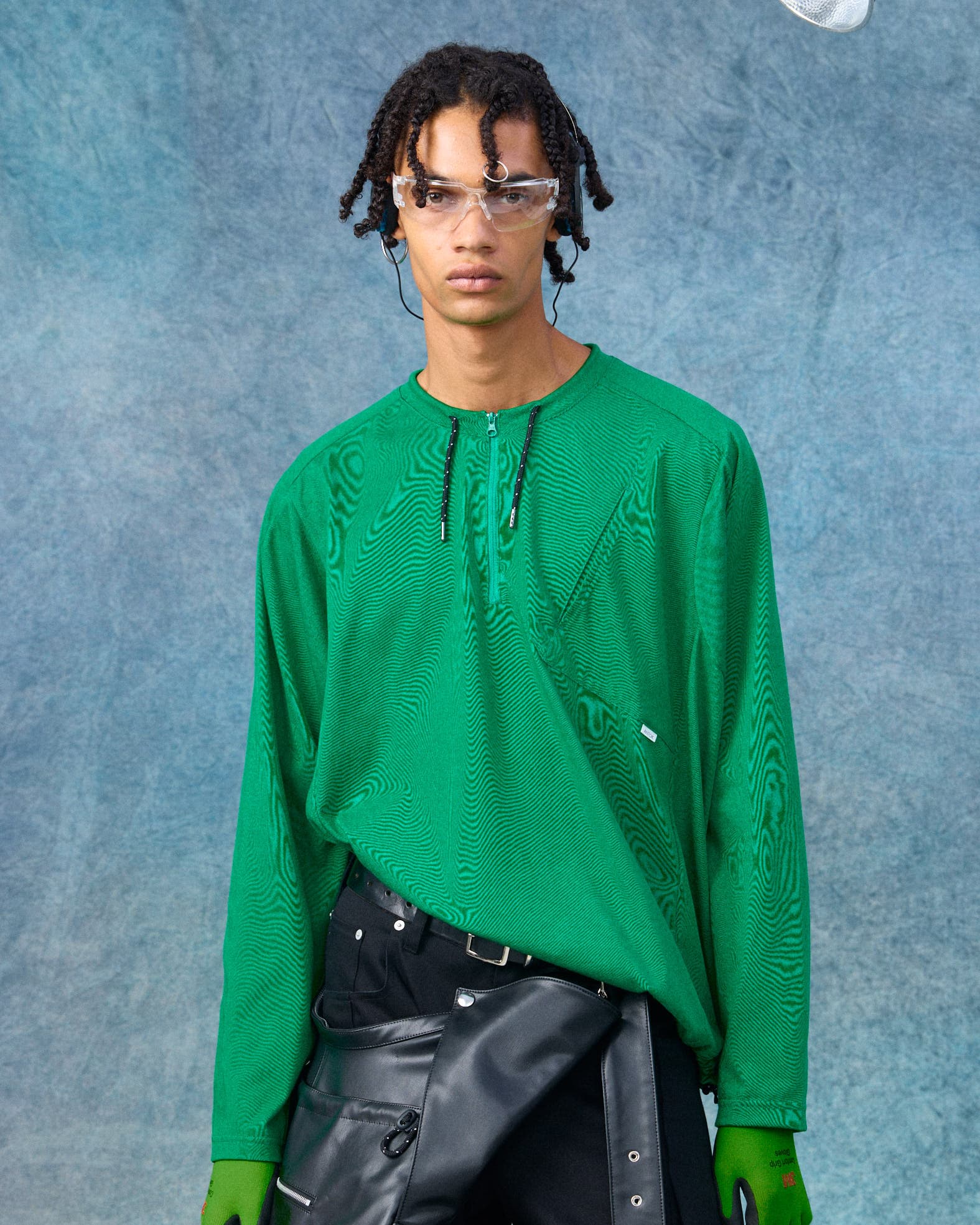 袖は可動域を広げる機能的なカッティングパターンを採用し、裾、衿にドローコードを通すことで、他のTシャツとは一線を画すデザイン性を持たせました。
