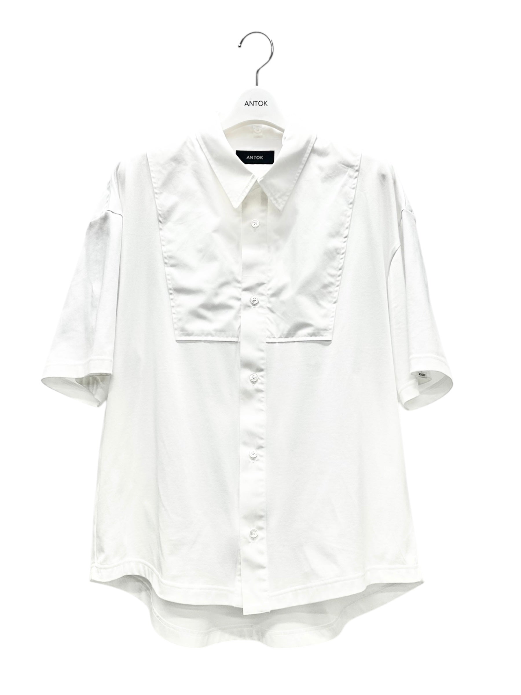 衿、前立て、ヨーク部分はシャツ地で仕立てており、シャツとしての見栄えをしっかり保ちつつ、メインボディにはストレッチ性のある天竺素材を使用しているため、肌触りも快適です。