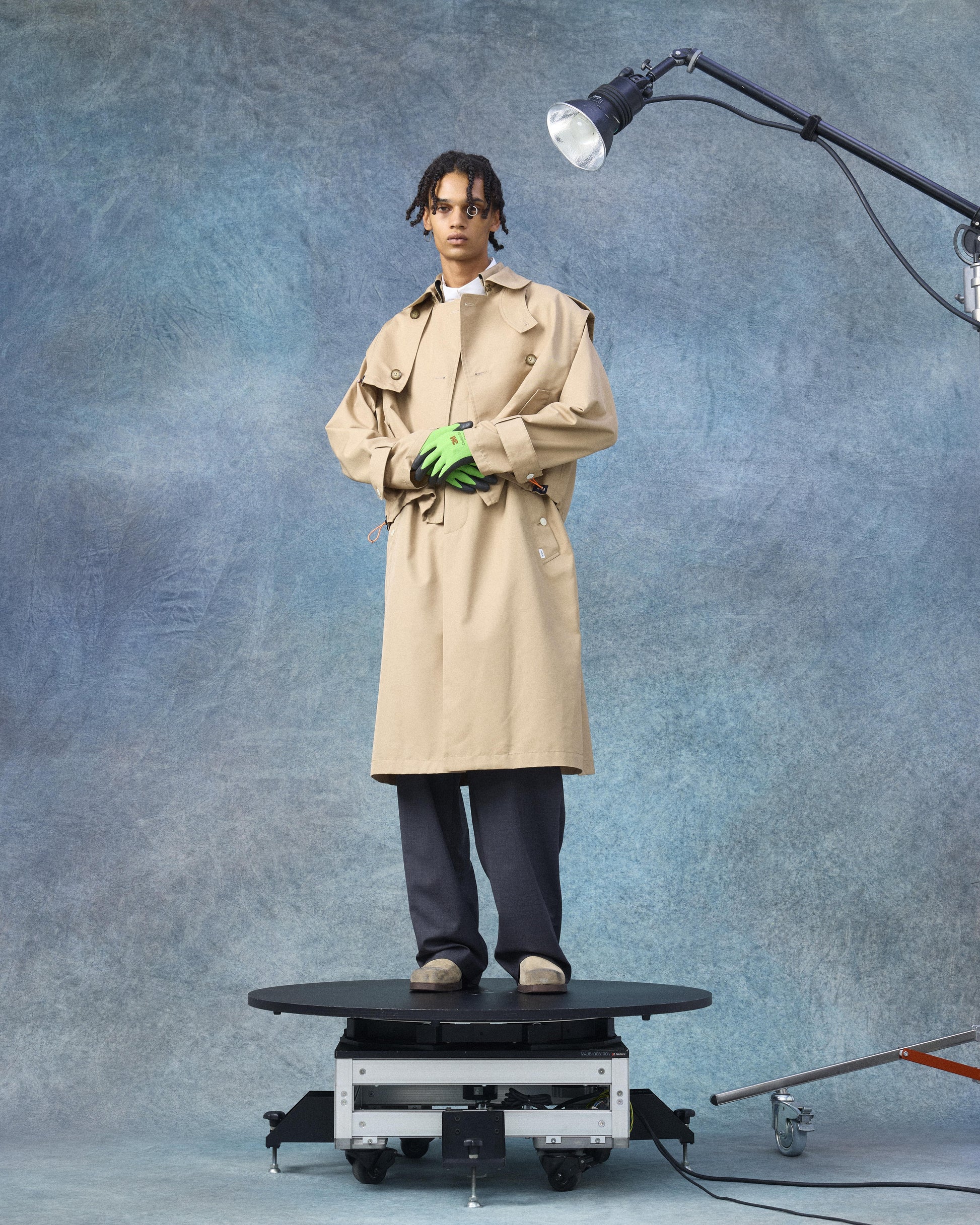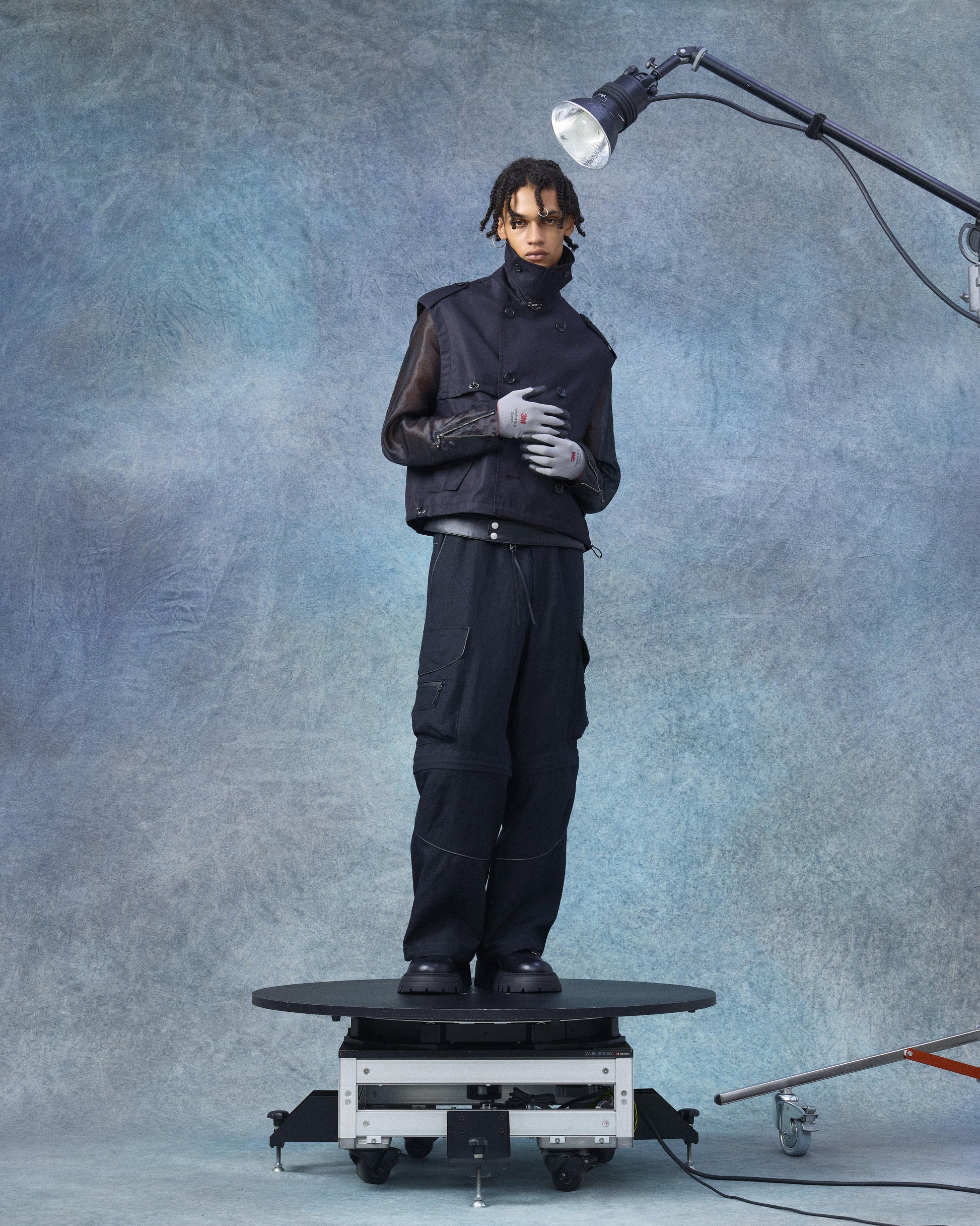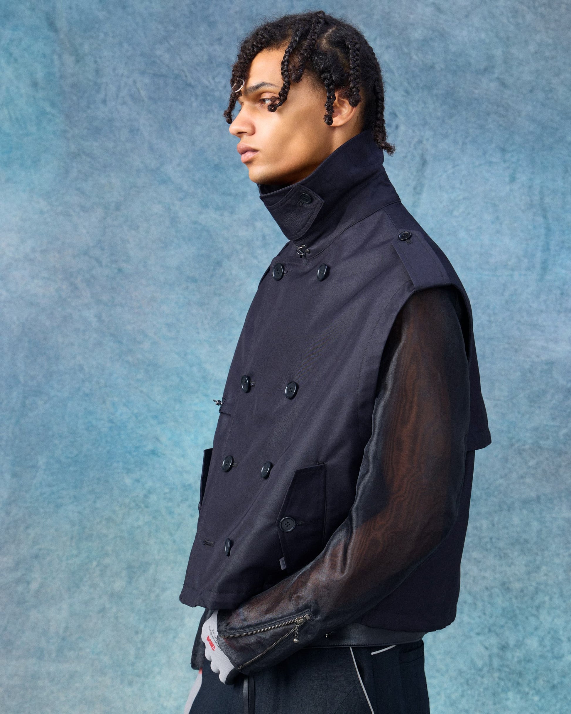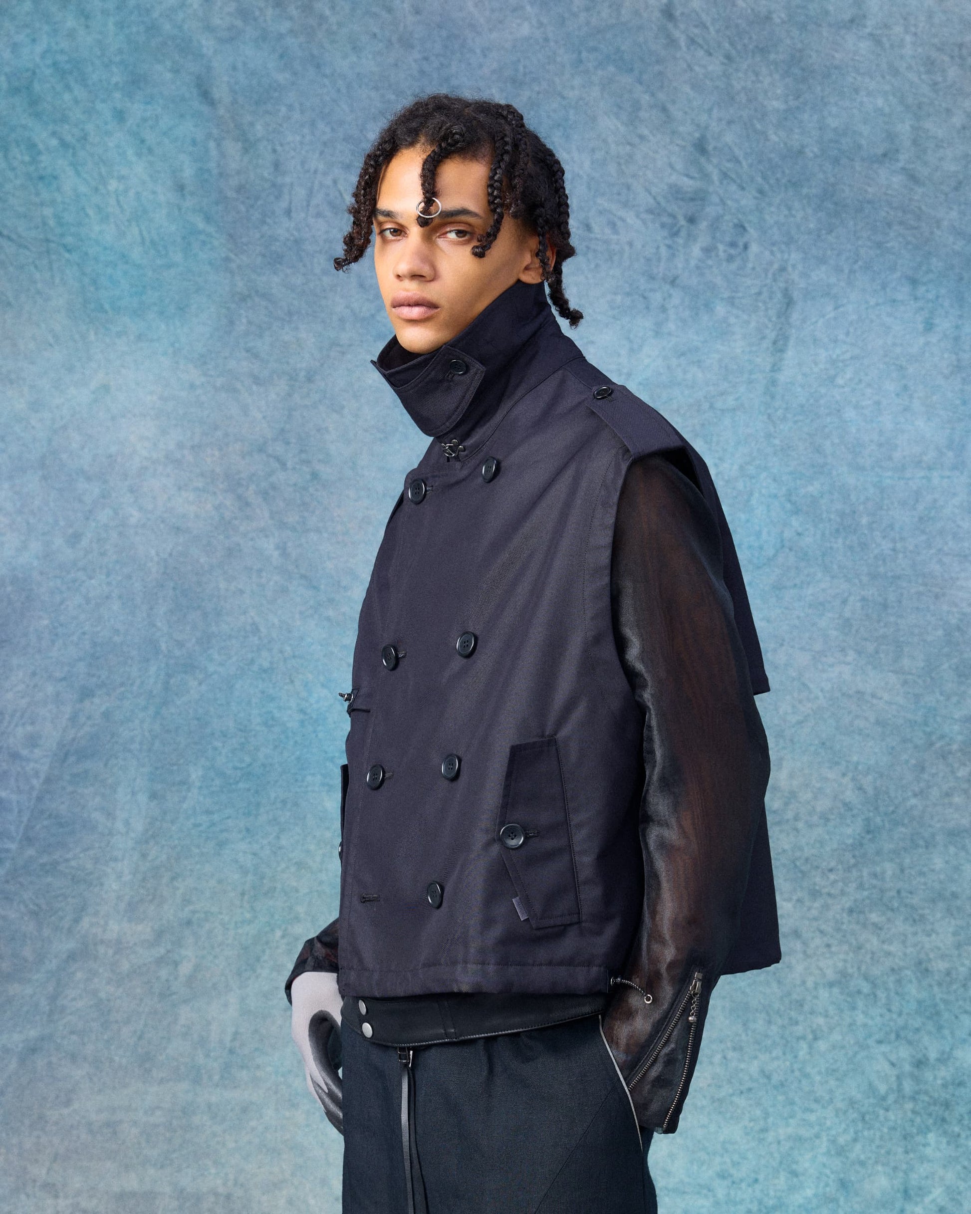 トレンチコートディティールとスポーティーなドローコードワークやメッシュを取り入れ、合わさる事のないテイストを合わせたベストです。
